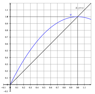 - On donne ci-contre la courbe représentative $\mathscr{C}$ de la fonction $f$ et la droite d'équation $y = x$ dans un repère orthonormal.