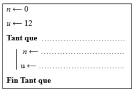 Recopier et compléter cet algorithme afin que la variable $n$ contienne après son exécution le plus petit entier $r$